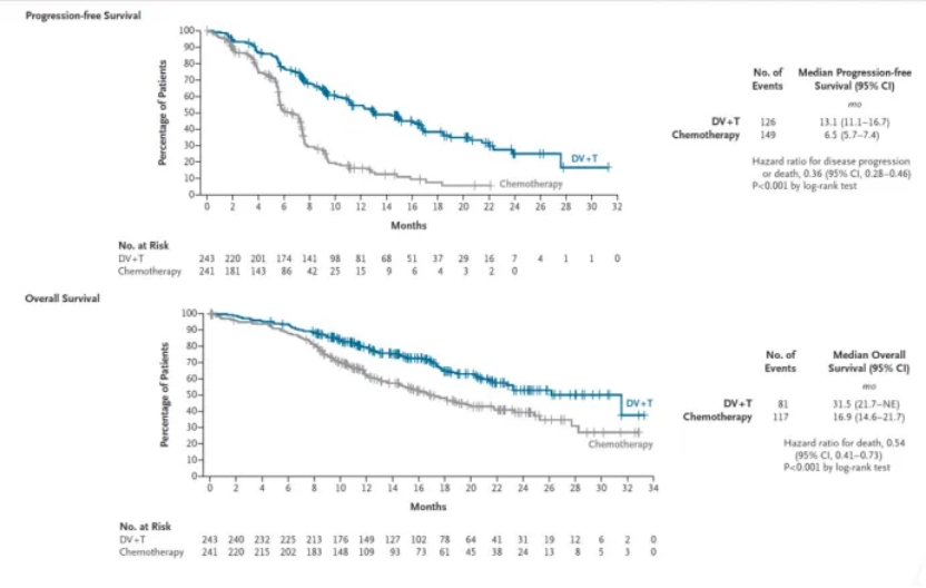RC48-016研究主要研究终点:联合治疗组较化疗对照组的无进展生存期(Progression-Free Survival,上图)与总生存期(Overall Survival,下图)双终点达到显著差异