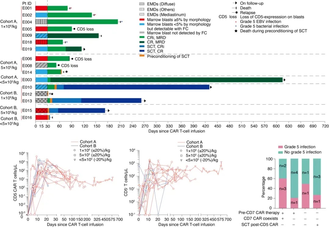 Complete Remission with incomplete blood count recovery (CRi) at day 30 post-infusion was achieved in 100% of patients. As of July 31, 2023, the median follow-up time was 14.3 months (IQR 6.2–19.7). Four patients received SCT on day 35 (IQR 31–40) post-infusion, of whom three remained disease-free, and one died from fungal infection. Among the 12 patients who did not receive SCT (7 refused, 3 relapsed before transplant, 2 died during SCT pre-treatment), 2 maintained remission, 3 relapsed, 5 died from infections (2 from EBV and 3 from bacterial infections), and 2 died from thrombotic microangiopathy. Of all treated patients, half of the grade 5 infections occurred in those with coexisting CD7 CAR-T cells who did not receive SCT consolidation. Low-level CD7 CAR-T cells did not affect the expansion of CD5 CAR-T cells, and CD5 CAR-T cells dominated until the last follow-up. CD5+ lymphocytes decreased, while CD5- lymphocytes increased, with some originating from CD5 gene-edited products.